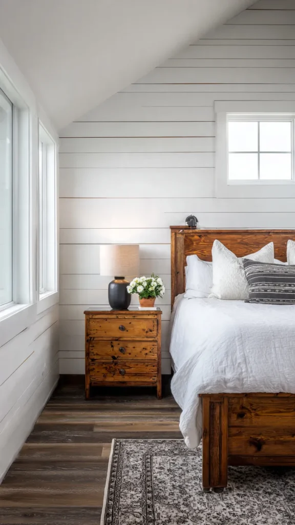 White shiplap walls brighten the bedroom and reflect natural light, making the space feel airy and calm. They provide a clean backdrop that allows furniture and décor to stand out gently rather than aggressively.