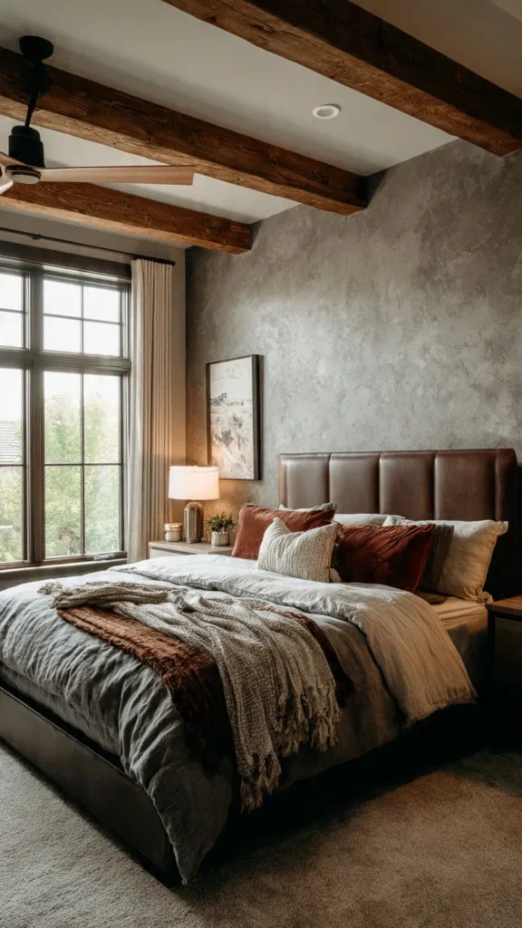 This contrast creates harmony between rustic strength and modern softness, resulting in a bedroom that feels both sturdy and serene.