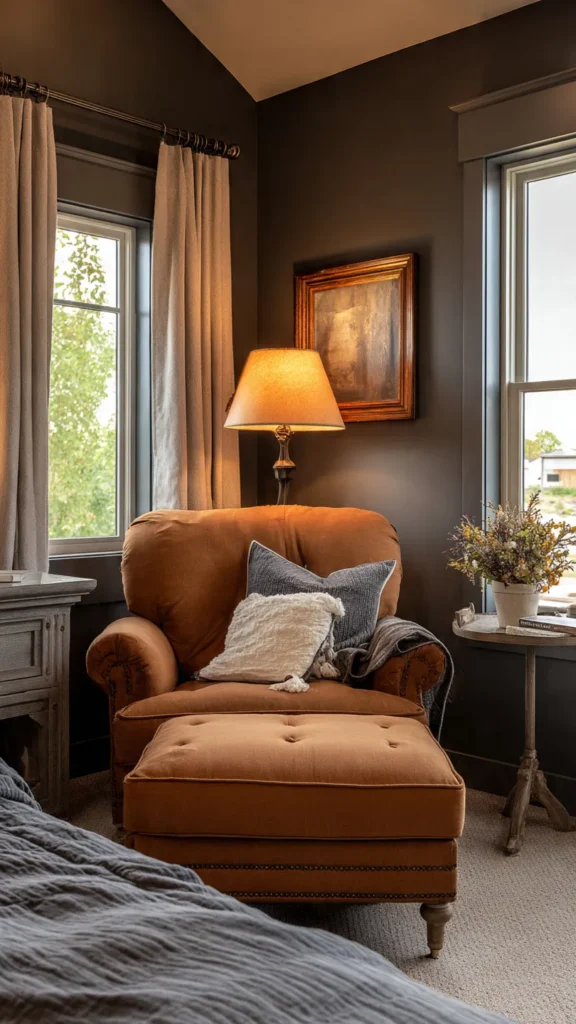 A reading nook adds function and comfort by creating a quiet place to relax beyond the bed. It becomes a personal retreat within the bedroom.