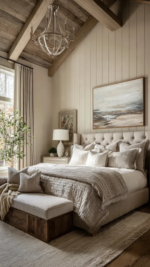 2. Exposed Wood Beams with Soft Neutral Bedding