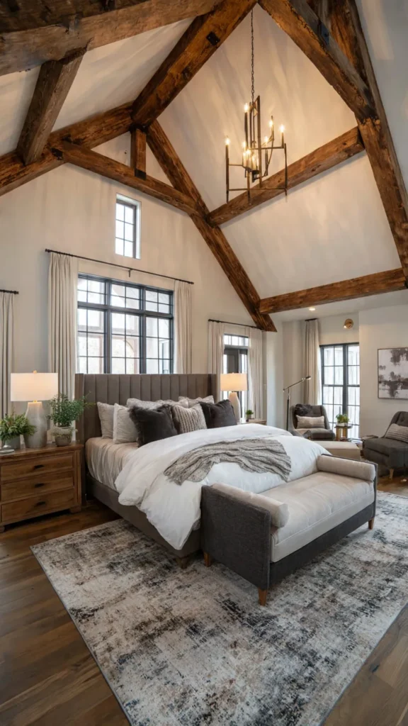 Soft neutral bedding balances the visual weight of the beams by keeping the bed area light and calming. Cream, beige, and pale gray tones enhance relaxation and encourage restful sleep.