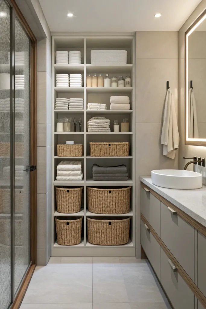 Many bathroom closets have wasted vertical space between shelves. Adjustable shelving allows you to customize heights based on what you store, whether it’s tall bottles or folded towels. Adding an extra shelf or two can instantly double your storage capacity without taking up more floor space.
