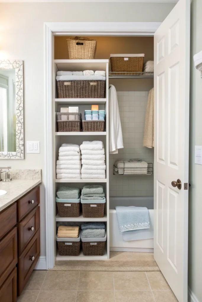 A well-organized bathroom closet can completely change how your bathroom functions and feels. Instead of digging through piles of towels, toiletries, and cleaning supplies, everything has a clear place and is easy to access.