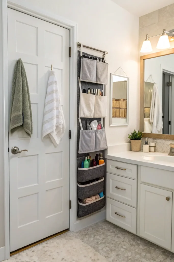The inside of the closet door is valuable storage real estate. Over-the-door organizers with pockets or hooks are perfect for hair tools, cleaning supplies, or small accessories. This solution keeps frequently used items accessible without taking up shelf space.
