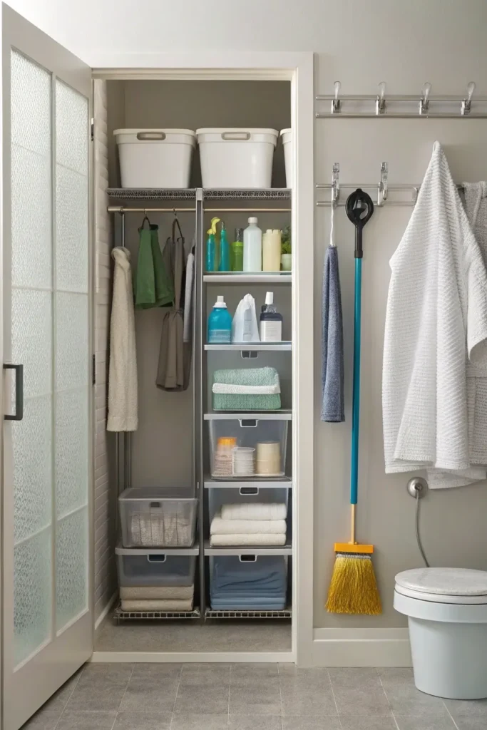 Hooks inside the closet are perfect for hanging robes, shower caps, or reusable bags. They keep items off shelves and within easy reach. Adhesive hooks are a great option if you want a damage-free solution.