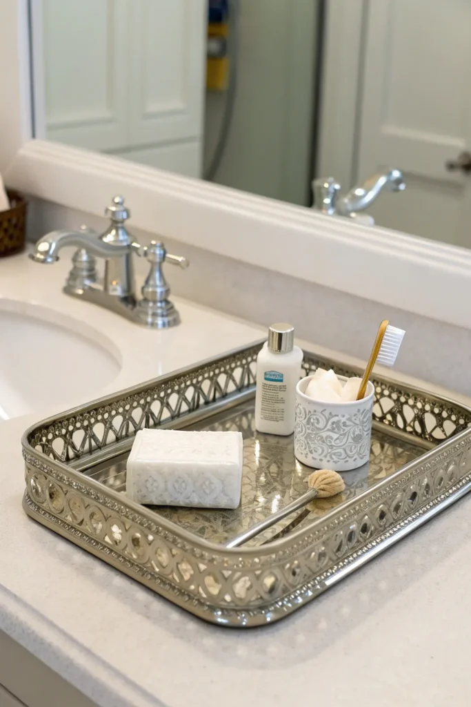 A simple decorative tray is one of the most effective ways to elevate bathroom counter décor. It brings structure and instantly makes your items look more organized. Choose a tray in marble, wood, brass, or acrylic depending on your bathroom aesthetic. Place your daily essentials—like soap, lotion, and a candle—within the tray for a clean, curated look that keeps clutter contained.