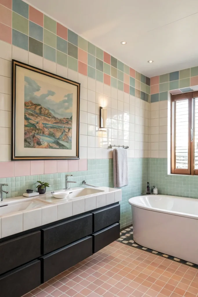 Lean a small piece of framed art or photography against the wall behind the counter. This creates depth, personality, and visual interest without requiring wall installation. Botanical prints, abstract art, or soft minimalist pieces work particularly well in bathrooms, adding character while still keeping the space serene.