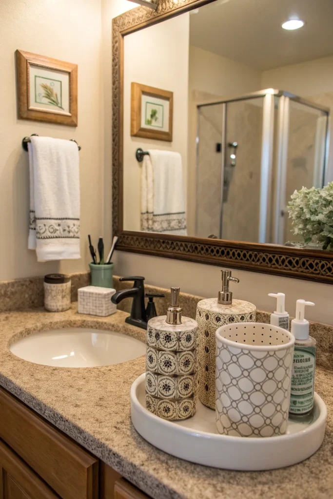 For those who love simplicity, a minimalist counter with only a few beautifully selected items can be strikingly elegant. Choose essentials that are both functional and aesthetically pleasing—like a matte soap dispenser, a single candle, and a small plant. This approach keeps the bathroom feeling airy, open, and clutter-free while still looking thoughtfully styled.