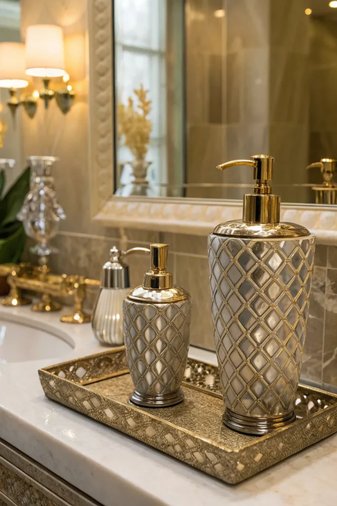 Swap out mismatched plastic bottles for elevated, refillable soap dispensers. Glass, ceramic, matte black, or metallic pumps quickly make your counter look more put-together. You can go for a matching set that includes hand soap and lotion for a cohesive aesthetic. This simple upgrade adds everyday luxury and reduces visual clutter.