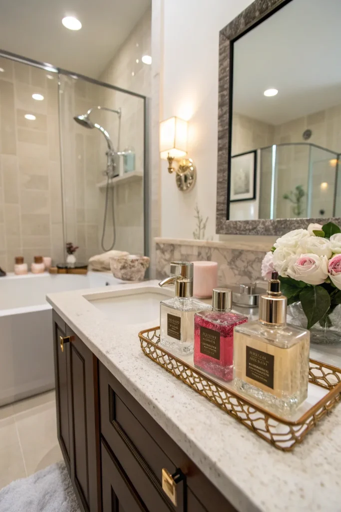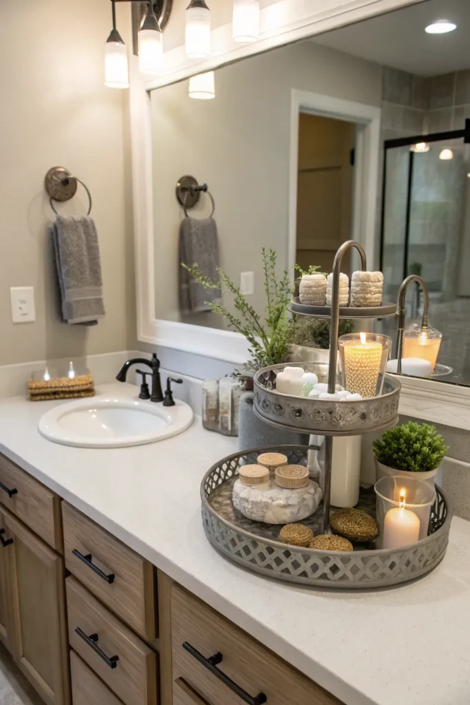 If you have a lot of essentials but want to maintain a clean look, a small tiered organizer can be incredibly helpful. Glass, wood, or acrylic tiered stands provide vertical storage for skincare, makeup, and daily items while still appearing decorative. This works especially well in smaller bathrooms where counter space is limited.