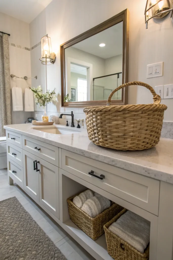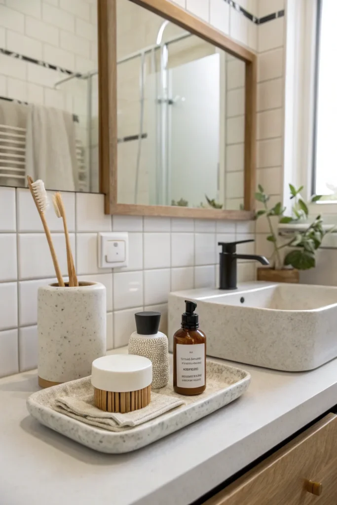 Natural materials like wood, rattan, woven baskets, and stone instantly add warmth and texture to bathroom counters. A small wooden tray, a woven basket for rolled washcloths, or a stone soap dish softens the look of sleek tile and metal fixtures. The mix of textures creates a spa-like, calming atmosphere that feels inviting and balanced.
