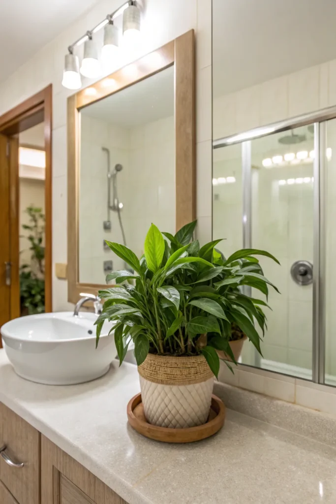 Adding a touch of greenery brings life and freshness to your bathroom counter. A small plant such as a pothos, tiny fern, orchid, or snake plant can thrive in bathroom humidity while adding natural softness to hard surfaces. If you prefer low-maintenance décor, choose a realistic faux plant. Greenery also pairs beautifully with any color palette, from minimalist neutrals to bold modern styles.