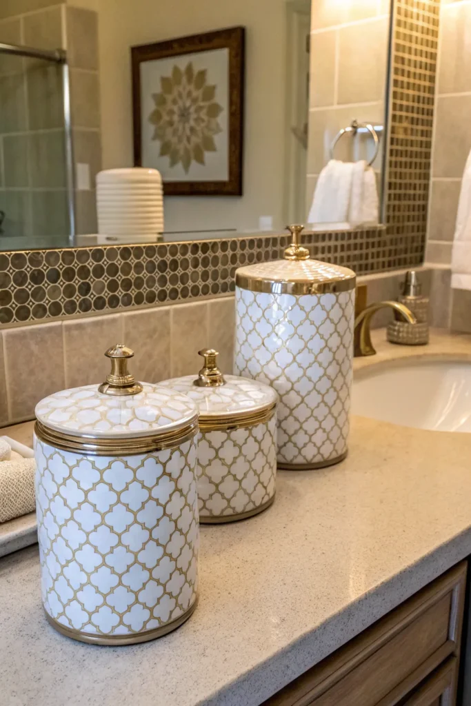 Glass or ceramic jars provide both style and functionality. Use them to store cotton pads, cotton swabs, bath salts, or small toiletries. Transparent jars give a clean and airy feel, while opaque options with wooden or metallic lids bring warmth and sophistication. Grouping jars together creates a tidy, intentional display that looks attractive and keeps essentials at arm’s reach.