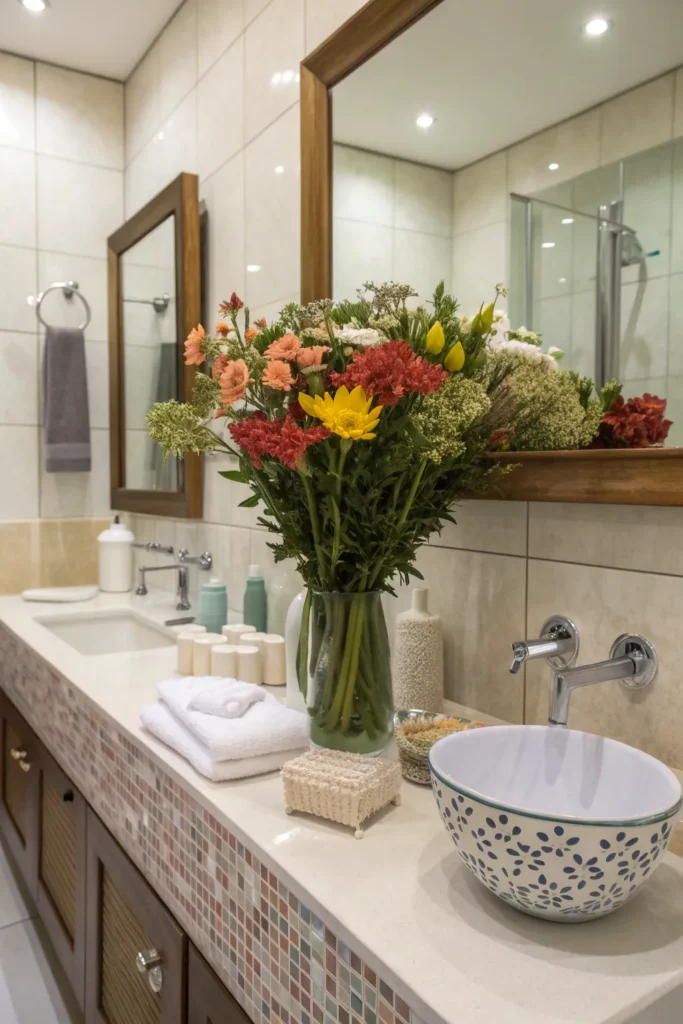A vase filled with fresh or faux flowers adds color, charm, and elegance to any bathroom counter. Choose soft blooms like roses, peonies, or tulips for a calming look, or opt for a single large flower in a minimalist vase for a modern touch. A tall vase works beautifully on larger counters, while smaller bud vases fit perfectly on compact vanities.