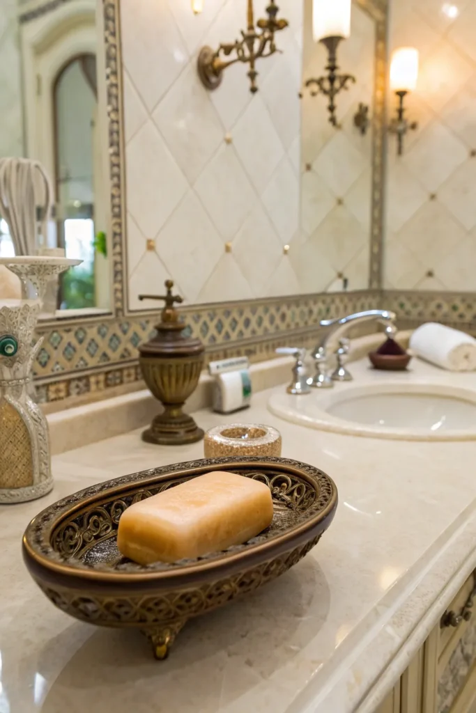 If you prefer bar soap, choose a stylish soap dish that complements your bathroom décor. Materials like marble, brass, ceramic, or teak wood add character and sophistication. Layering multiple artisanal soap bars in coordinating colors can also create a visually appealing display, especially in a guest bathroom.