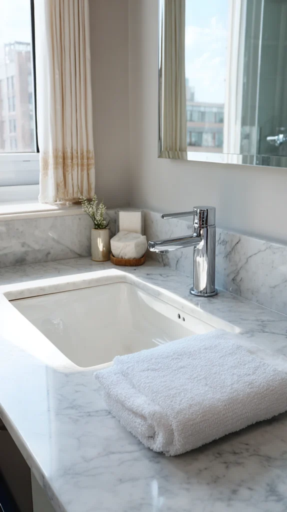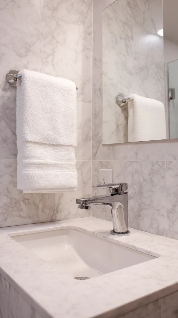 The temporary surface update transforms one of the bathroom’s most visible elements while remaining completely reversible. Remove carefully when moving using heat from hair dryers softening adhesive for clean removal without countertop damage.
