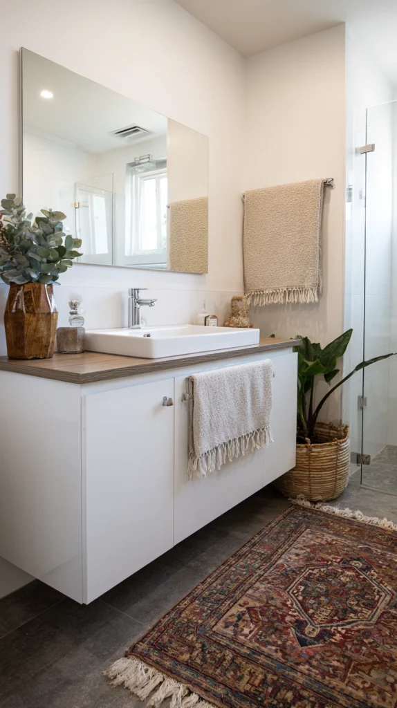Introduce color, pattern, and comfort through bathroom rugs, window treatments, and decorative towels transforming spaces through textiles requiring no permanent installation. Choose bath mats in colors complementing or contrasting with existing tile creating intentional color relationships, hang coordinating shower curtains and window curtains, and display attractive towels in complementary hues.