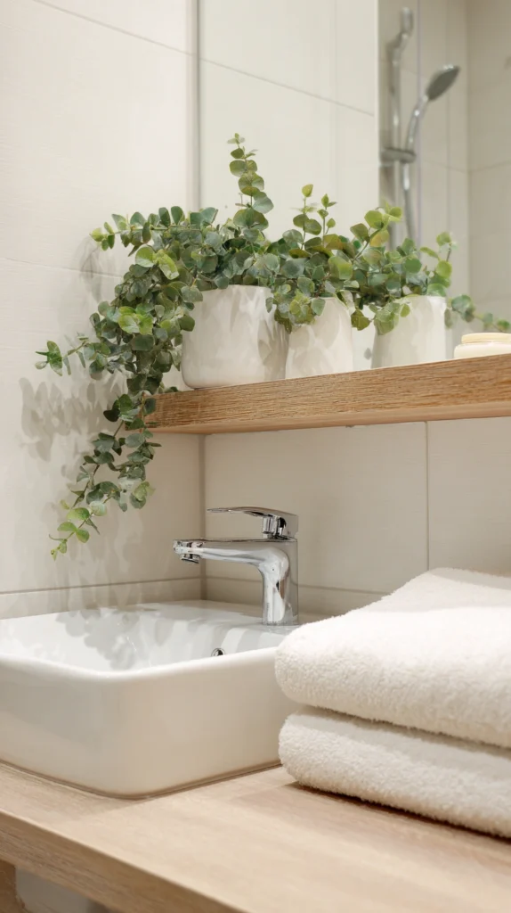 Display in attractive containers coordinating with your color scheme, position on existing shelving or countertops requiring no installation, or hang from existing shower curtain rods or towel bars using S-hooks. The greenery adds life and softness while requiring no permanent changes to physical spaces.