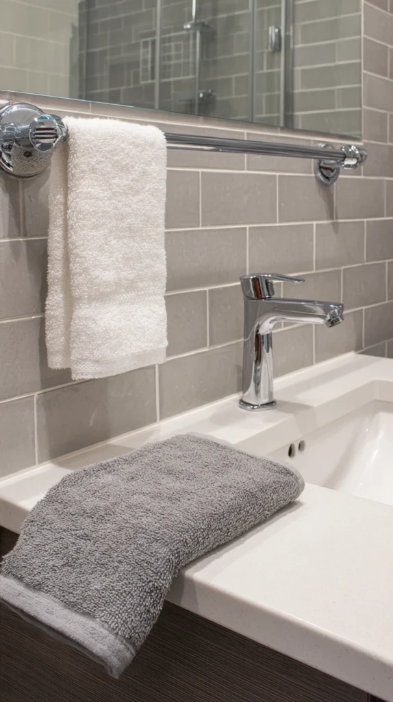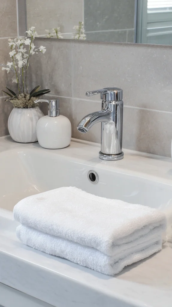 Replace basic cabinet hardware, towel bars, toilet paper holders, and shower curtain rods with upgraded alternatives in consistent finishes creating cohesive updated appearances throughout the space. Choose one metal finish—brass, brushed nickel, matte black—using it consistently for all replaced hardware creating professional coordination.