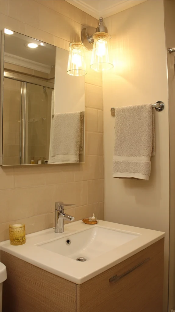 Supplement inadequate overhead lighting through plug-in sconces, LED strip lights, or portable lamps improving both functionality and ambiance without hardwiring landlords prohibit. Install battery-operated sconces flanking mirrors providing task lighting for grooming, add LED strips under cabinets or shelving creating ambient glow, or position small table lamps on counters or shelving adding warmth.