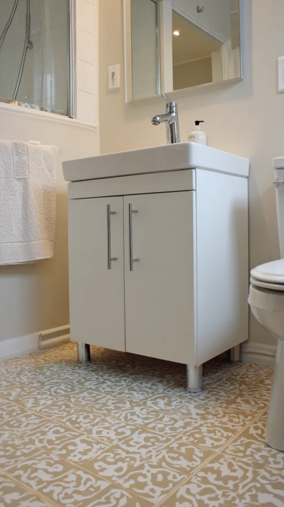 Cover dated vinyl floors or small tile areas using removable vinyl floor decals in patterns mimicking tile, creating temporary updates that transform floor aesthetics dramatically. Choose designs in scales appropriate for bathroom dimensions—smaller patterns for compact spaces, larger geometric designs for more generous rooms.