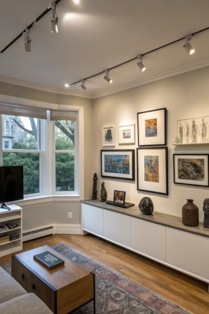 - Track lighting extending from the ceiling to highlight art