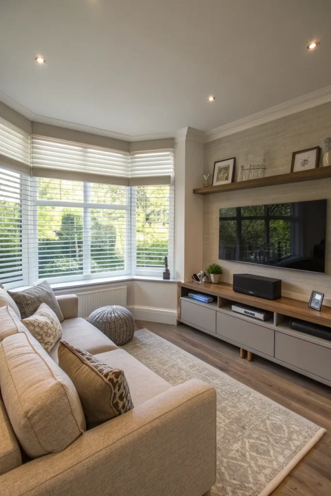 Bay windows can anchor a modern TV lounge by blending seating, storage, and screen placement into a cohesive living setup.