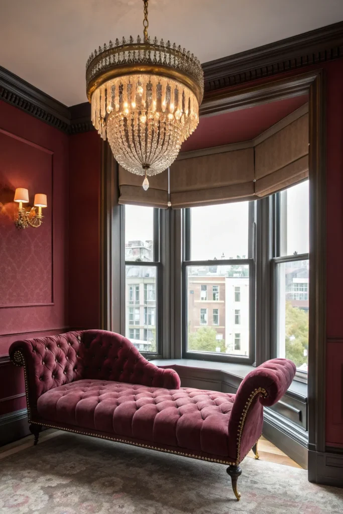 - Velvet seating or a dramatic chaise in the bay