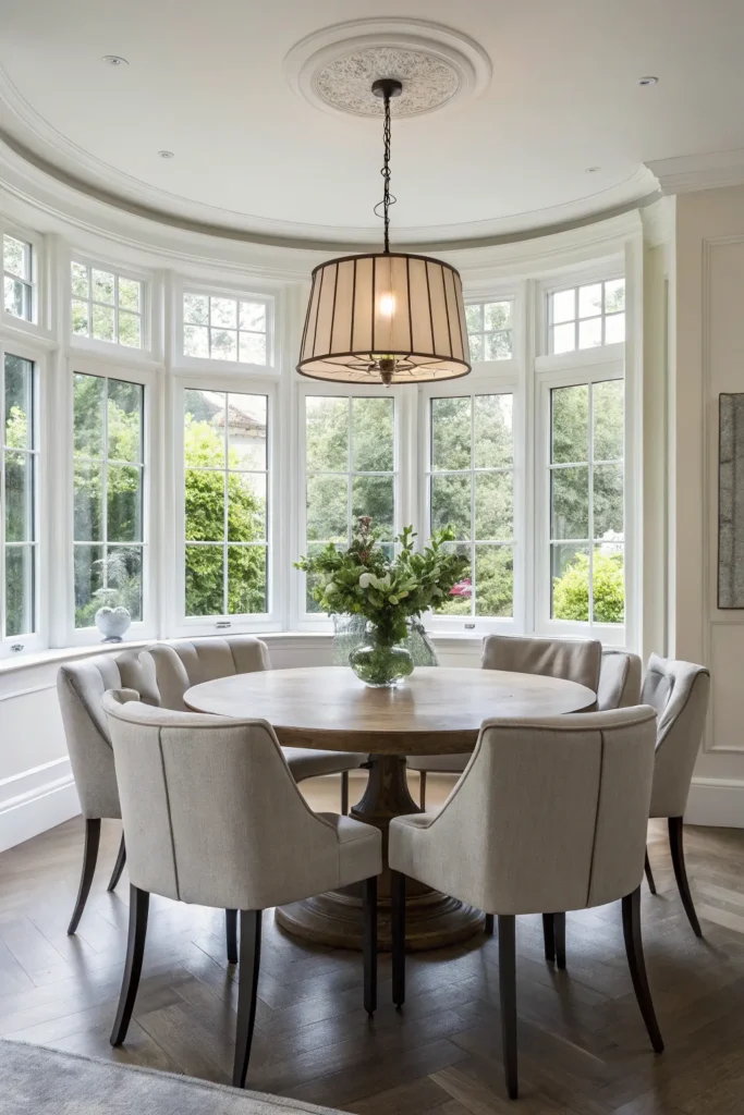 - Round or oval dining table aligned with the curve of the bay