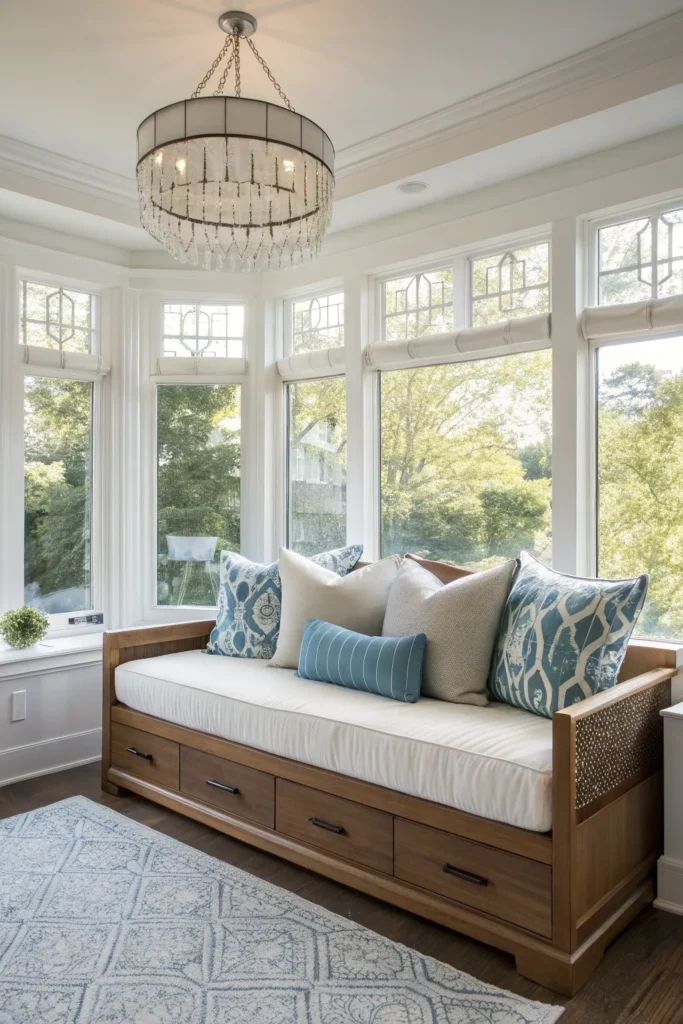 Instead of traditional seating, place a full daybed in the bay that flows with the room’s decor. It doubles as a statement piece while offering comfort.
