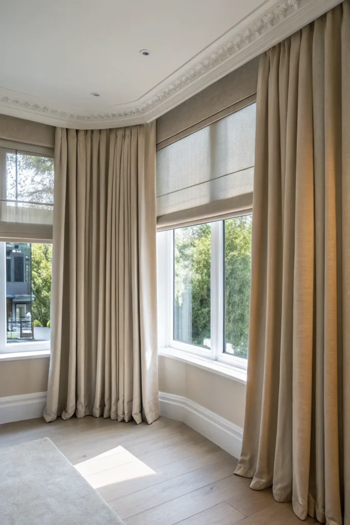 Think of your bay not as separate, but as part of the full room’s rhythm. Drapery can unify everything when extended across both bay and straight windows.