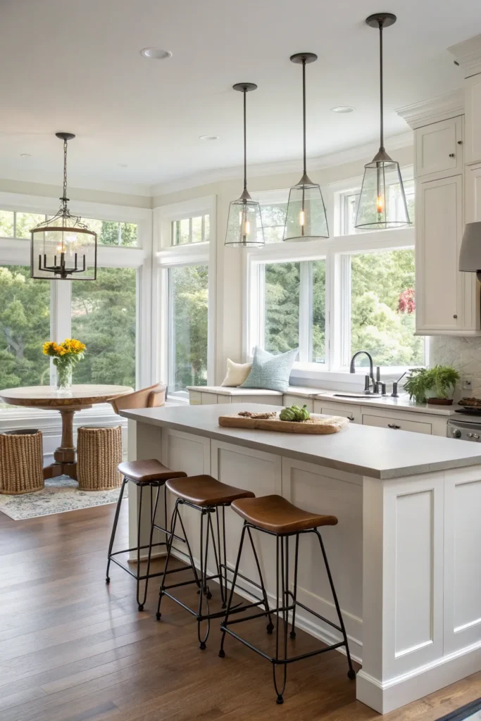 In kitchens or combined spaces, a bay window can completely reshape the dining experience into a bright, airy breakfast bar.
