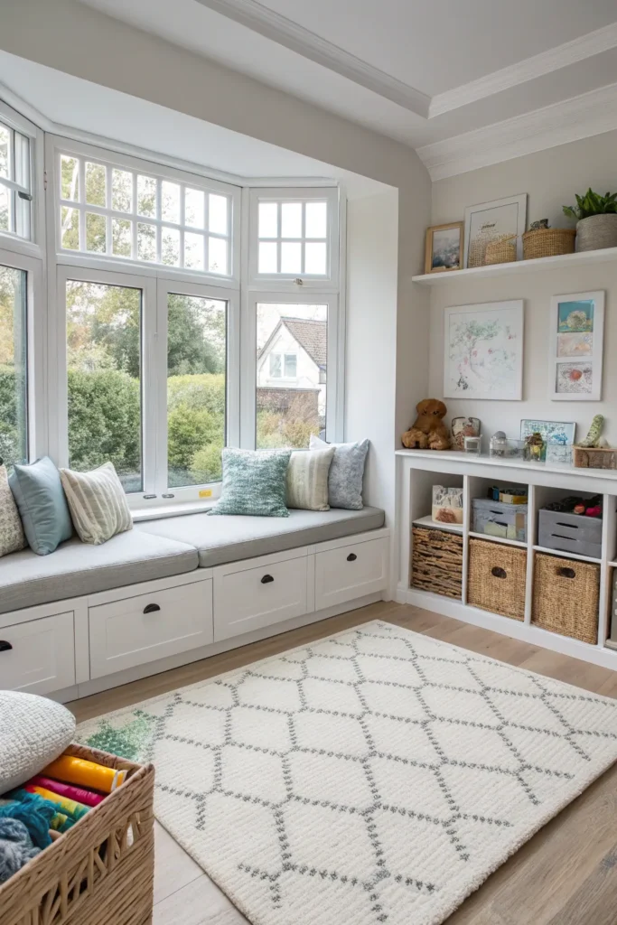 A bay window can become the anchor for a kid-friendly living room that balances play and modern design.