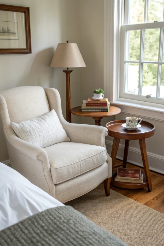 A comfortable armchair paired with a small side table is one of the simplest and most effective bedroom sitting area ideas. Choose an upholstered chair in a soft fabric like linen or velvet for added warmth. Place a round or square side table beside it for books, a lamp, or a cup of tea. This setup works beautifully in corners and near windows, creating a peaceful spot for reading or quiet moments.