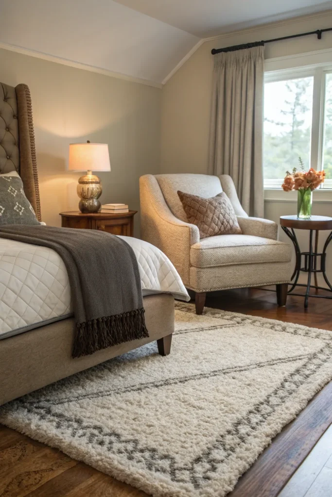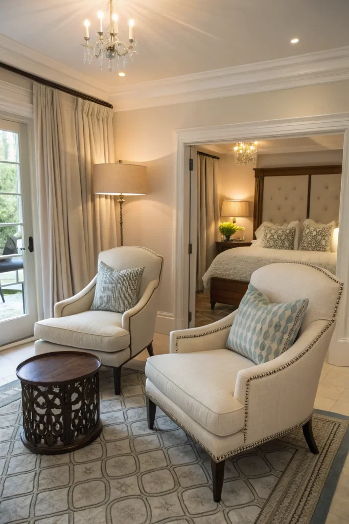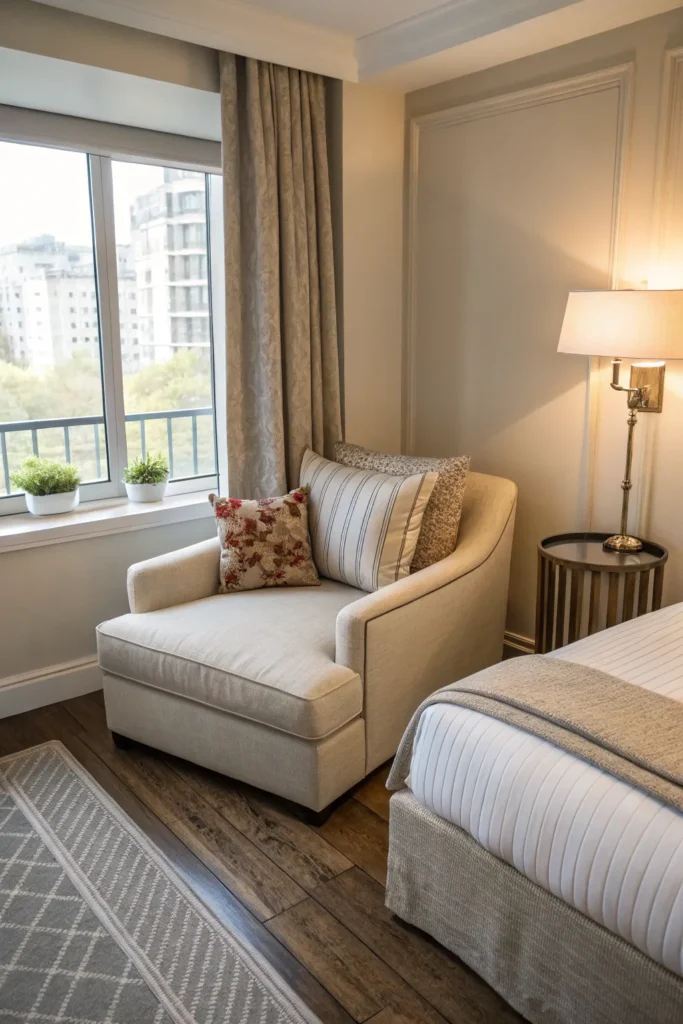 If you have enough space, consider placing two matching or complementary chairs with a small table between them. This setup creates symmetry and is perfect for couples who want a shared sitting area. It also works well in larger bedrooms where a single chair might feel lost.