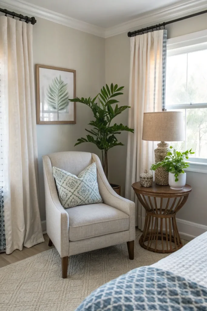 Adding greenery to your sitting area brings life and calm to the bedroom. Place a chair in the corner with a small table and a potted plant nearby. Natural elements like plants create a serene atmosphere and enhance the feeling of a personal retreat.