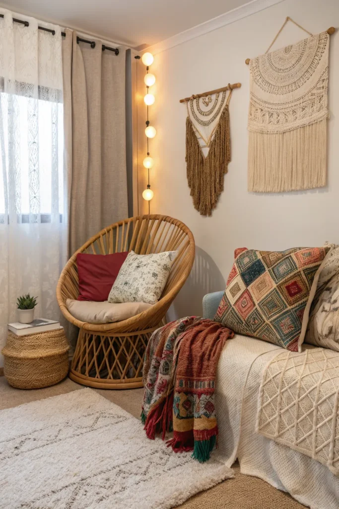 For a relaxed and creative vibe, design a boho-style sitting area. Use a woven chair, layered textiles, and patterned cushions. This style feels cozy and expressive, making the bedroom a warm and welcoming space to unwind.