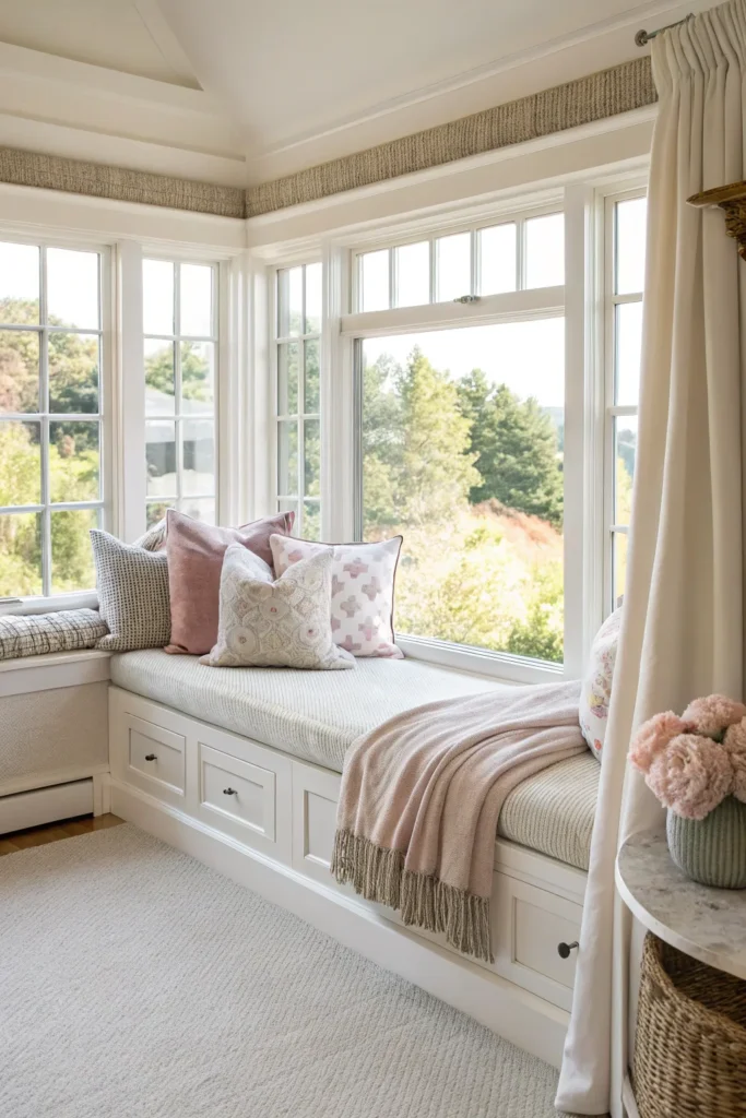 If your bedroom has a window with enough space beneath it, a window seat can instantly elevate the room. Add a built-in bench or a freestanding upholstered seat and layer it with plush cushions and throws. Natural light makes this sitting area feel fresh and uplifting, while the cozy seating encourages relaxation and daydreaming.