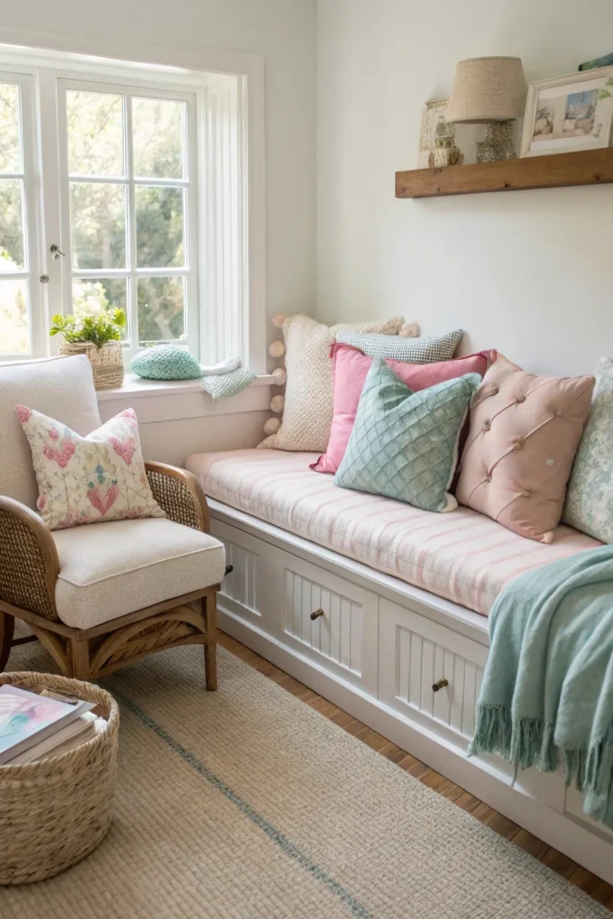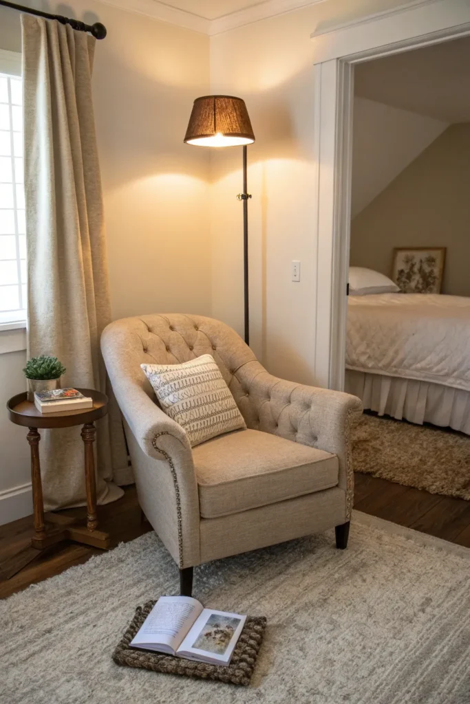 Turn an unused corner into a charming reading nook by placing a comfortable chair, a soft rug, and a tall floor lamp. This creates a defined sitting area without the need for bulky furniture. A reading nook is perfect for winding down before bedtime and adds personality to the bedroom.