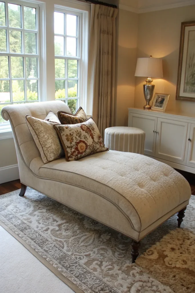 A chaise lounge instantly brings sophistication to a bedroom sitting area. Its elongated shape allows you to stretch out comfortably, making it ideal for lounging or afternoon naps. Place it near a window or across from the bed for balance and visual interest.