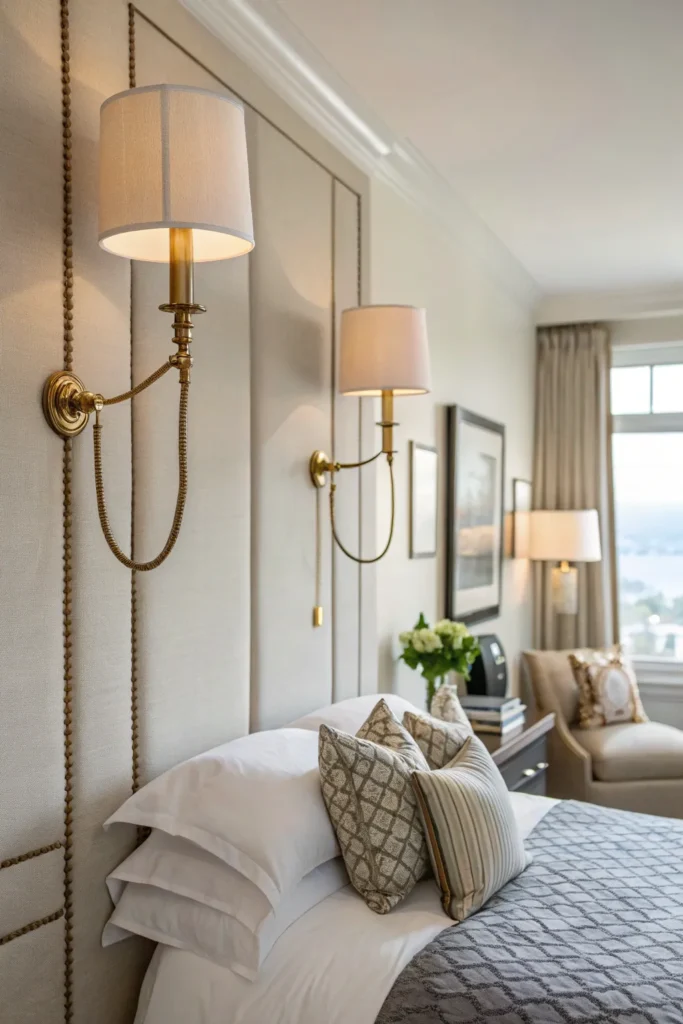 These sconces often work best with warm LED bulbs to soften the look and prevent harsh lighting. Mounted symmetrically on both sides of the bed, they create balance and a hotel-inspired feel while keeping nightstands completely clear.