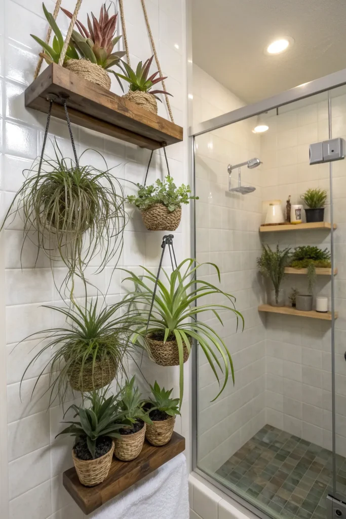 Air plants are unique because they don’t require soil. They absorb moisture and nutrients directly through their leaves, which makes them perfect for high-humidity bathrooms. They can be displayed creatively on wood, shells, glass, or mounted hangers.