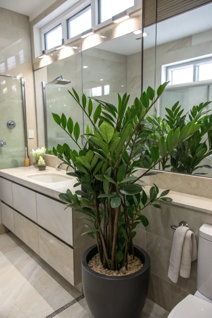 The ZZ plant is glossy, sturdy, and ideal for low-light bathrooms with fluctuating humidity. It stores water in its stems and slowly absorbs moisture from the air, making it perfect for humid areas.
