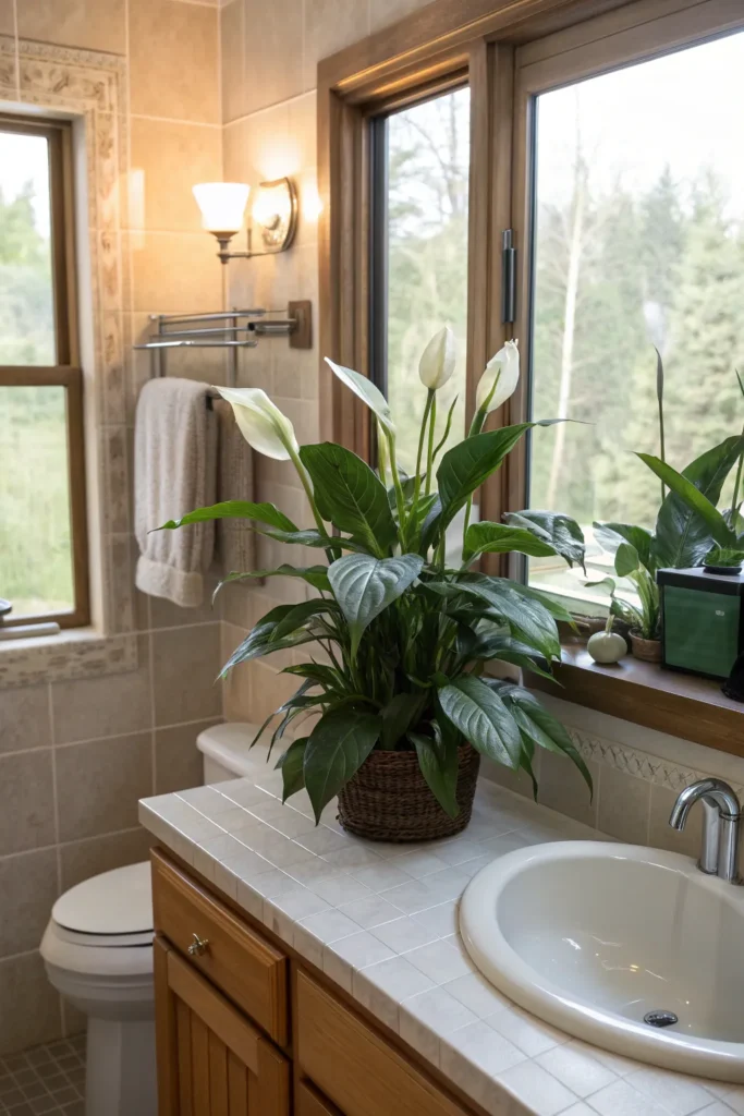 Peace lilies do best in low to medium light and prefer soil that is lightly moist but never soggy. Cleaning the leaves periodically helps improve their ability to draw moisture from the air. With minimal care, they remain one of the most reliable bathroom plants.