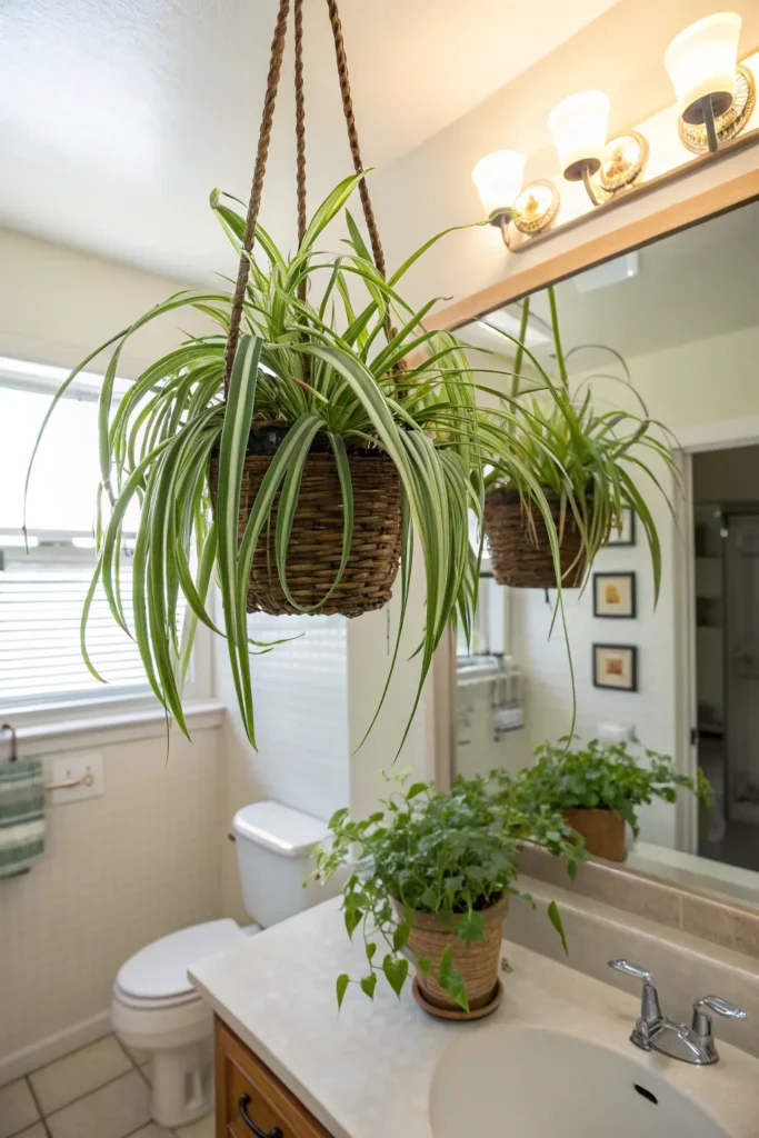 They thrive in moderate indirect light and can be placed on shelves, counters, or hanging baskets. Trimming off brown tips keeps them looking crisp, especially in bathrooms with hard tap water.
