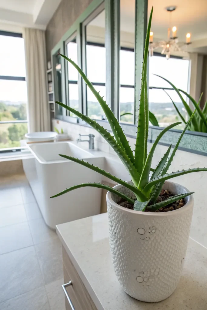 Aloe vera isn’t just a healing plant—it’s also a natural moisture absorber. Because it pulls water from its surroundings, aloe thrives in humid bathrooms and requires very little watering.