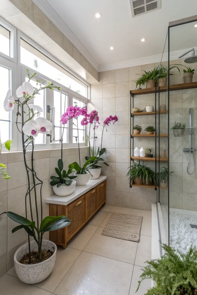 Orchids love steamy, warm environments, making bathrooms one of the best spots to grow them successfully. Increased humidity helps them bloom, and their leaves naturally absorb moisture from the air. Their elegant flowers elevate your bathroom instantly.