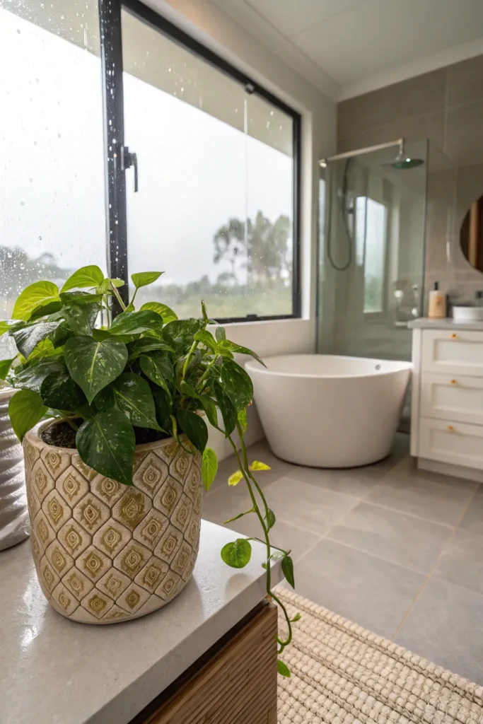 Golden pothos is a humidity-loving superstar. Its heart-shaped leaves flourish in low light, and it’s known for absorbing humidity and filtering air pollutants. It’s one of the easiest bathroom plants, perfect for beginners.