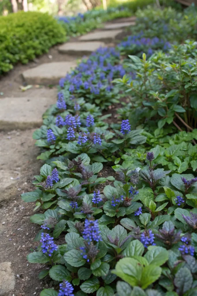 A tough groundcover that offers shiny leaves and small blue flowers, Ajuga fills gaps between shrubs or along shaded paths.