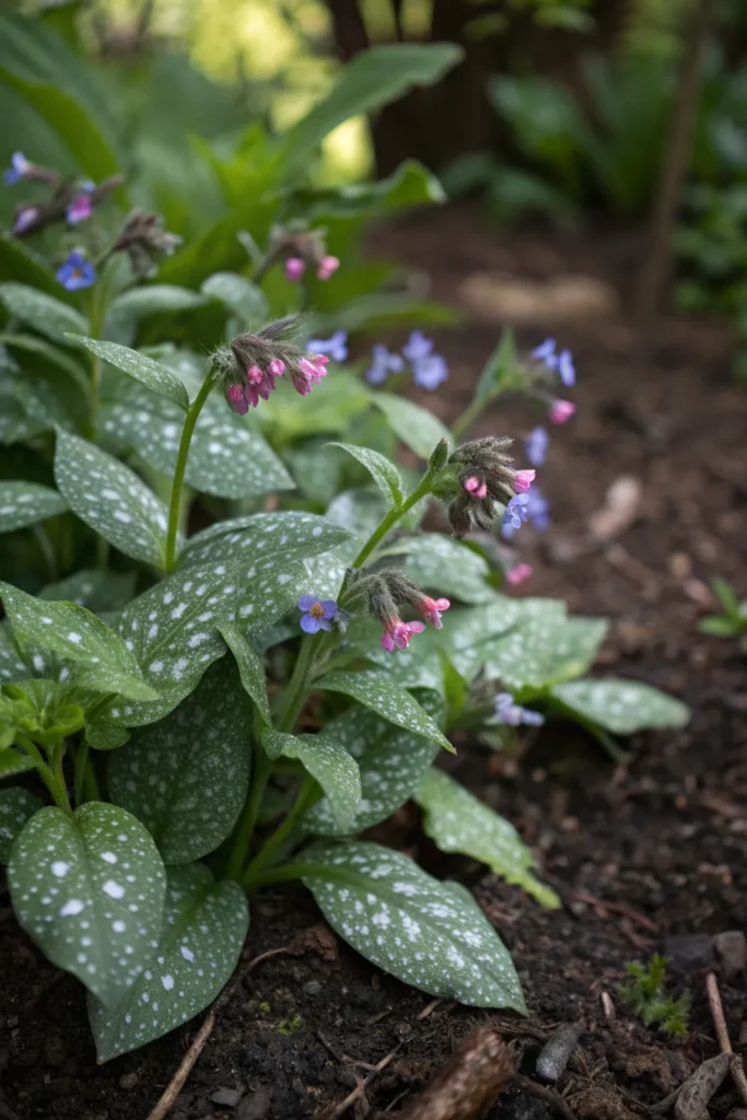Lungwort features speckled leaves and small pink or blue flowers that add a pop of color to shade-heavy spaces.